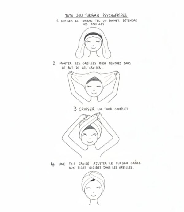 Conseils d’utilisationEnfilez le turban comme un bonnet. Prenez soin de bien détendre les oreilles.