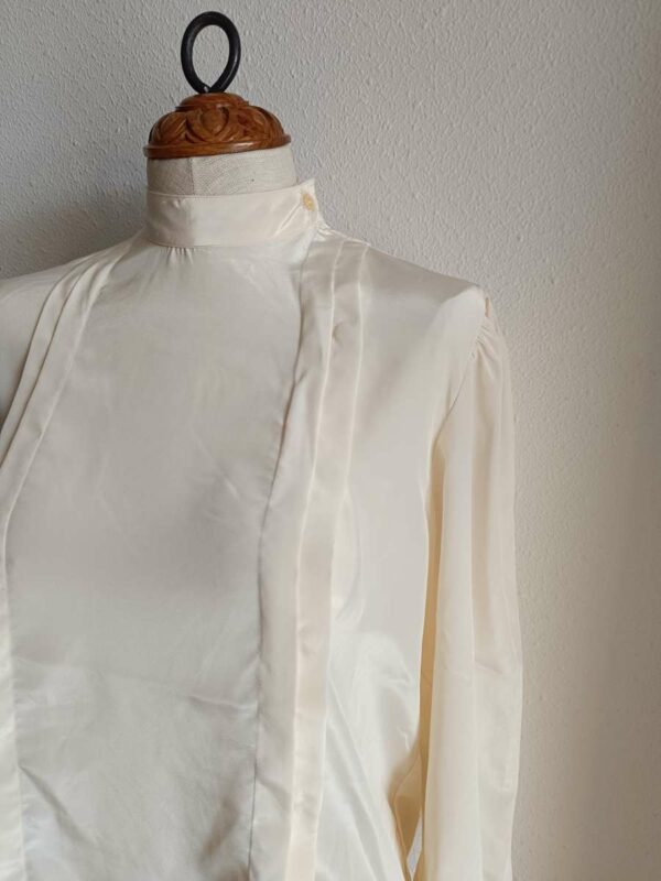 Chemisier vintage au style années 80, élégant et intemporel. Sa coupe fluide, son col montant discret et ses lignes verticales apportent une allure chic et soignée, idéale aussi bien pour une tenue de travail que pour un look plus rétro assumé.