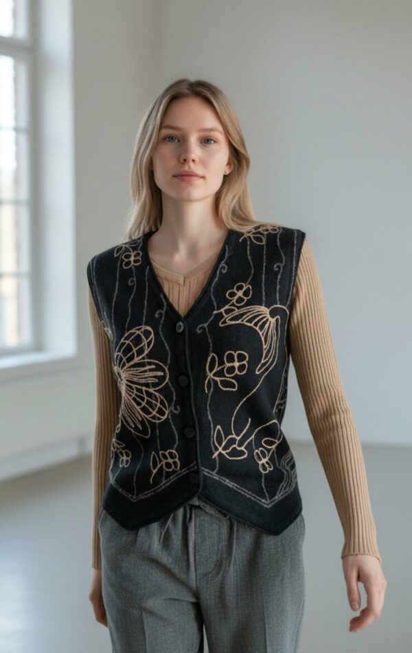 Ce gilet vintage Chacok est une pièce élégante et singulière, caractéristique de l’univers créatif et